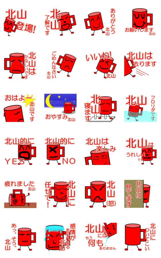 苗字が北山の名前スタンプです。宮田さん専用スタンプと同じくコップのキャラクターで作りました。佐藤や加藤に比べて少ないですが、学校の友達との会話で使ってください。