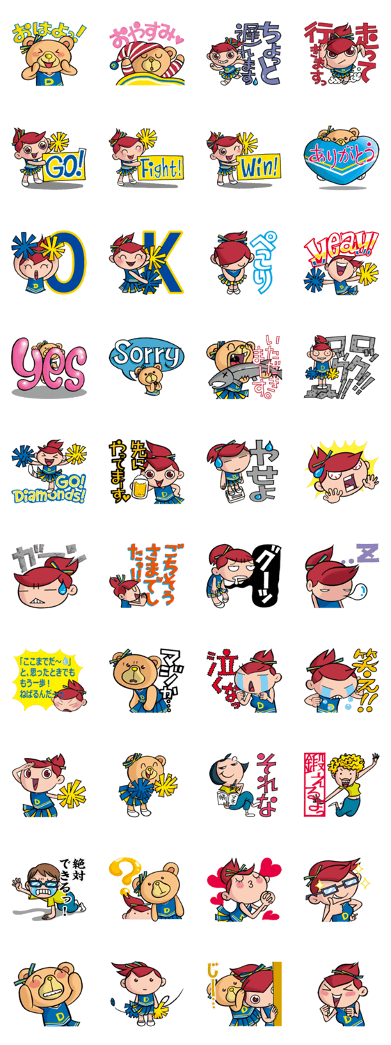 | スタンプ説明 | 2006年9月に立ち上げた、チアリーディングクラブDiamondsの10周年を記念して作ったスタンプ!Diamondsのキャラクター達のスタンプで元気、勇気、笑顔! |