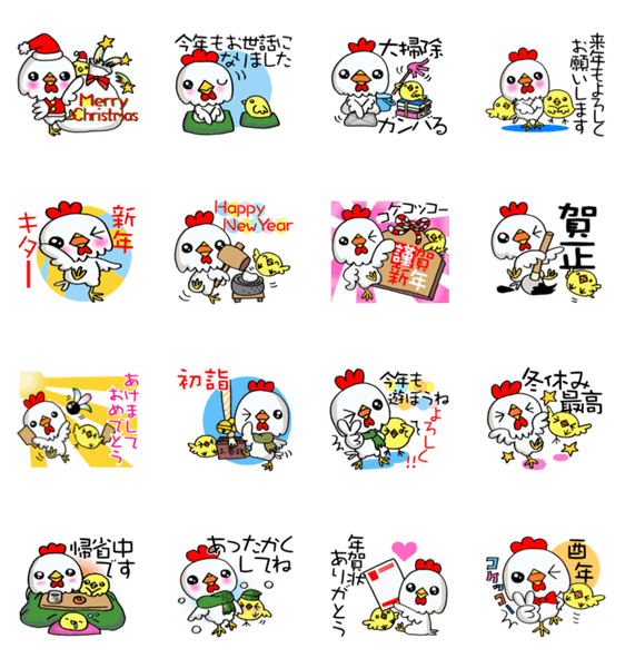 ニワトリが酉年を祝う年末年始用のスタンプです。あけましておめでとうの挨拶やフライングしてクリスマスにも使えます♪お正月に是非!
