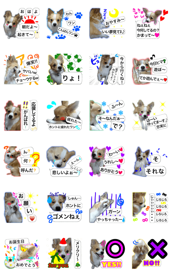 友達の愛犬、とっても可愛いロングコートチワワのユズちゃんの写真を使った、日常で使える吹き出しスタンプです♪