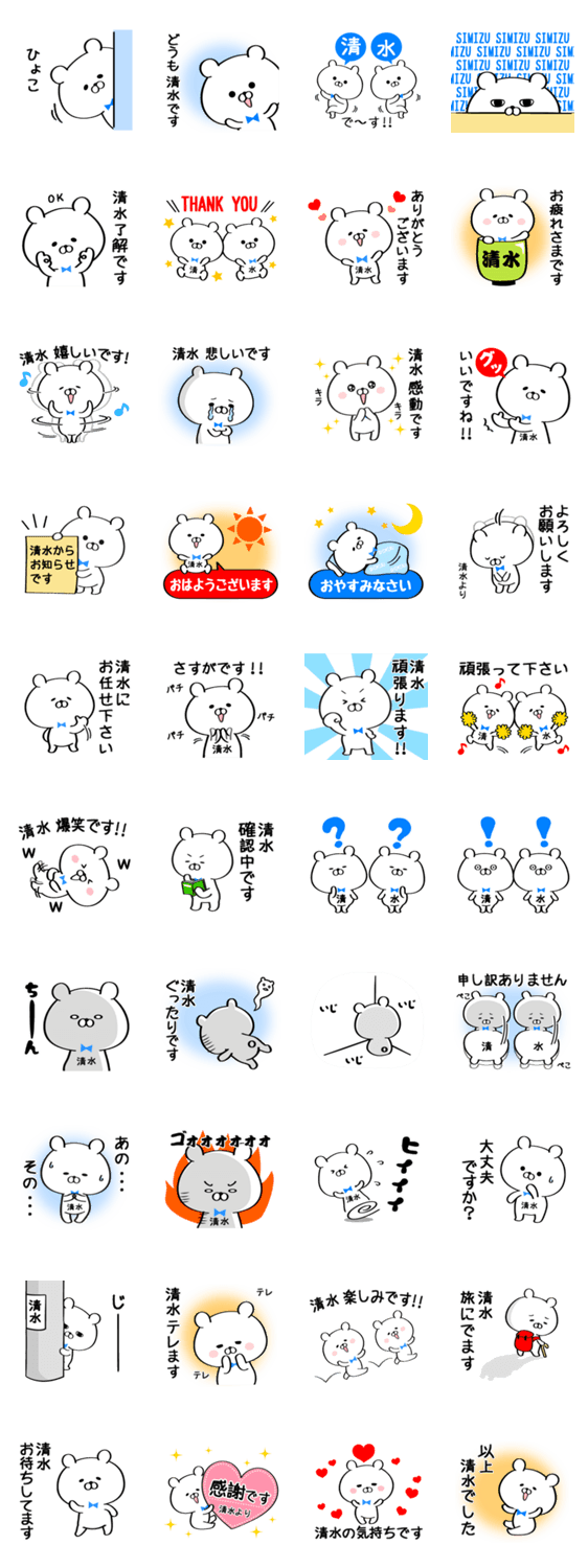 名字(苗字)清水(しみず)さんが使うクマの名前スタンプです。仕事仲間にも使えるように敬語・ですます調になっています。
