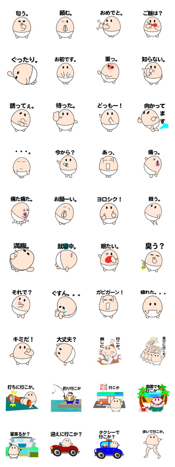 むきたまくんがお送りするお誘い、お返事、日常会話コミュニケーションスタンプ第2弾。