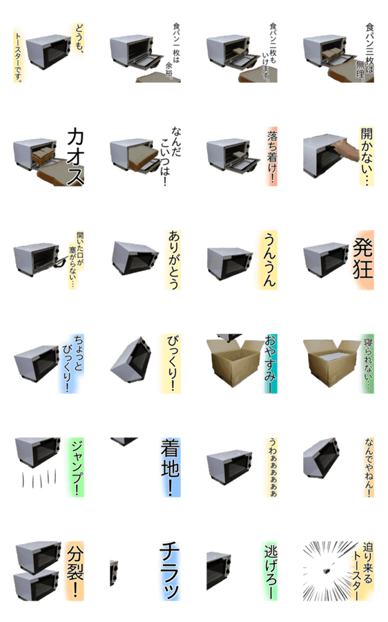 パンを焼いたりするトースターが、実写になって登場!日常会話や意外と使えるトースターのスタンプを作ってみました。実写の食パンも登場するよ!