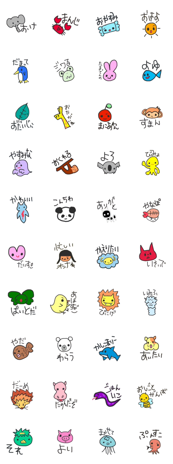 カラフルなどうぶつたちのスタンプです!かに、うさぎ、ぱんだたちの汎用性があるひとことがかわいい!