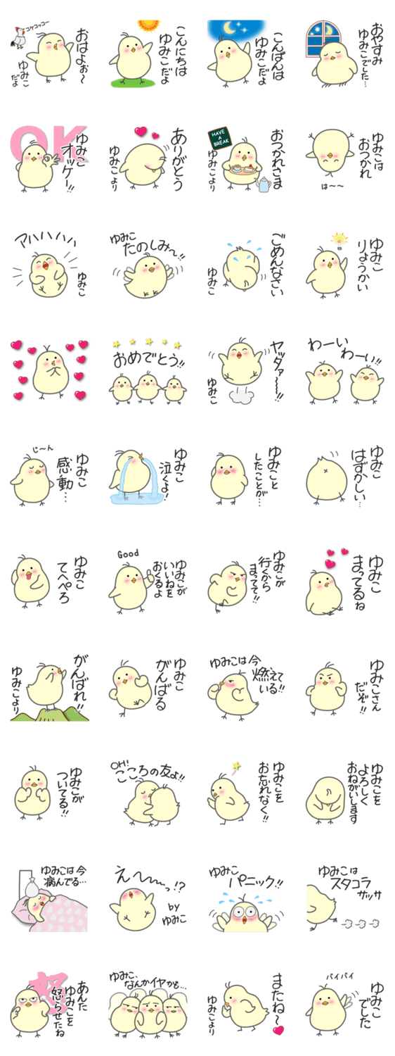 | スタンプ説明 | 【ゆみこ】さん専用スタンプです。可愛いヒヨコが日常生活でよく使うフレーズや相づちを、忙しいあなたの代わりにつぶやきます。 |