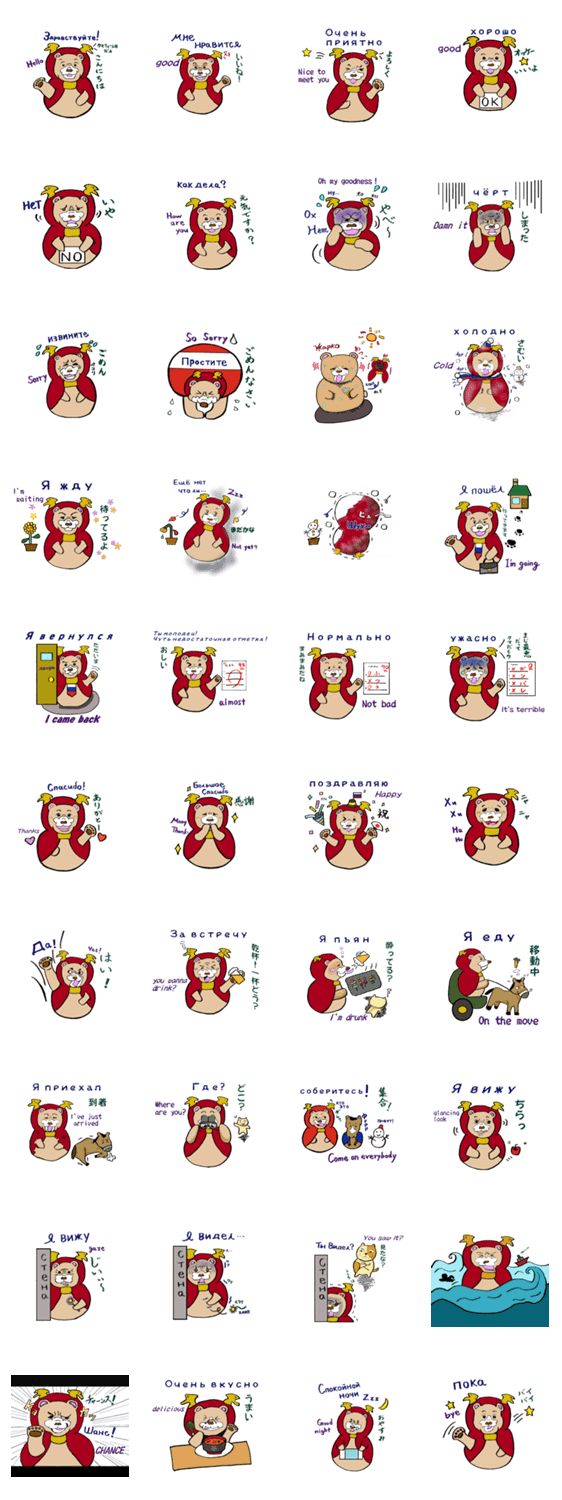 クマのマトリョーシカが、あなたの会話を盛り上げます! 日本語・英語・ロシア語に対応。このスタンプを使って外国人とも楽しく会話してみましょう。