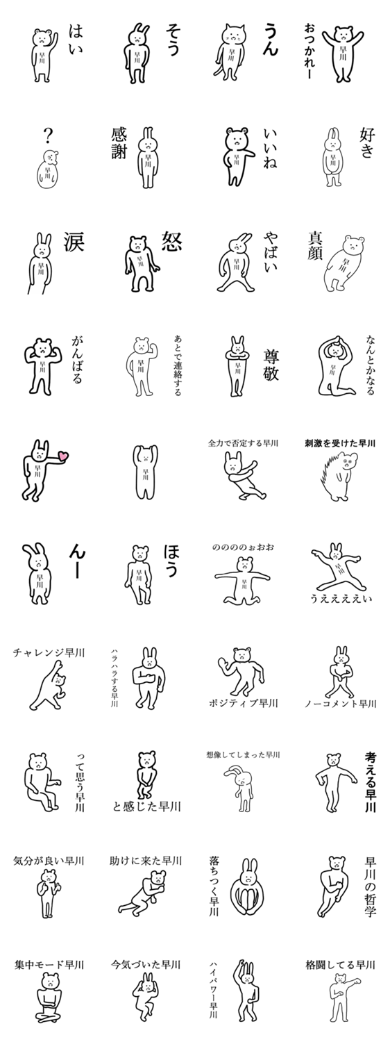 | スタンプ説明 | 40個のシンプル早川さんスタンプです。日本全国の早川さんが日常会話に使えるスタンプ&お友達お知り合いの早川さんに向けて送る苗字(名字)スタンプです。 |