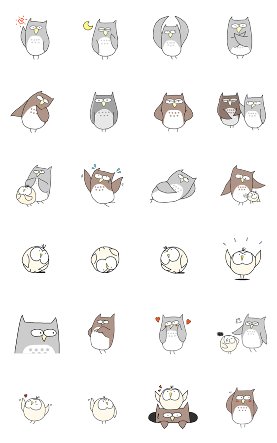 ゆるくて、ちょっと変なふくろうのスタンプ。(24個入り) 文字がないので色々な場面でつかいやすくしています。白ふち付きなので、濃い背景にも対応。