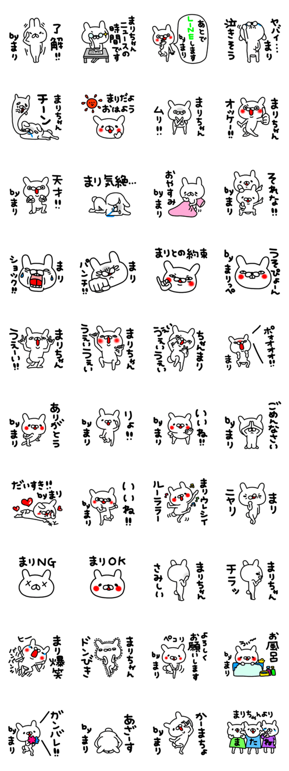 まり、まりこ、まりえ、まりの、まりお。全国の「マリちゃん」専用の名前スタンプです。デカ文字&日常会話の基本セット。(ちょっとうざい)
