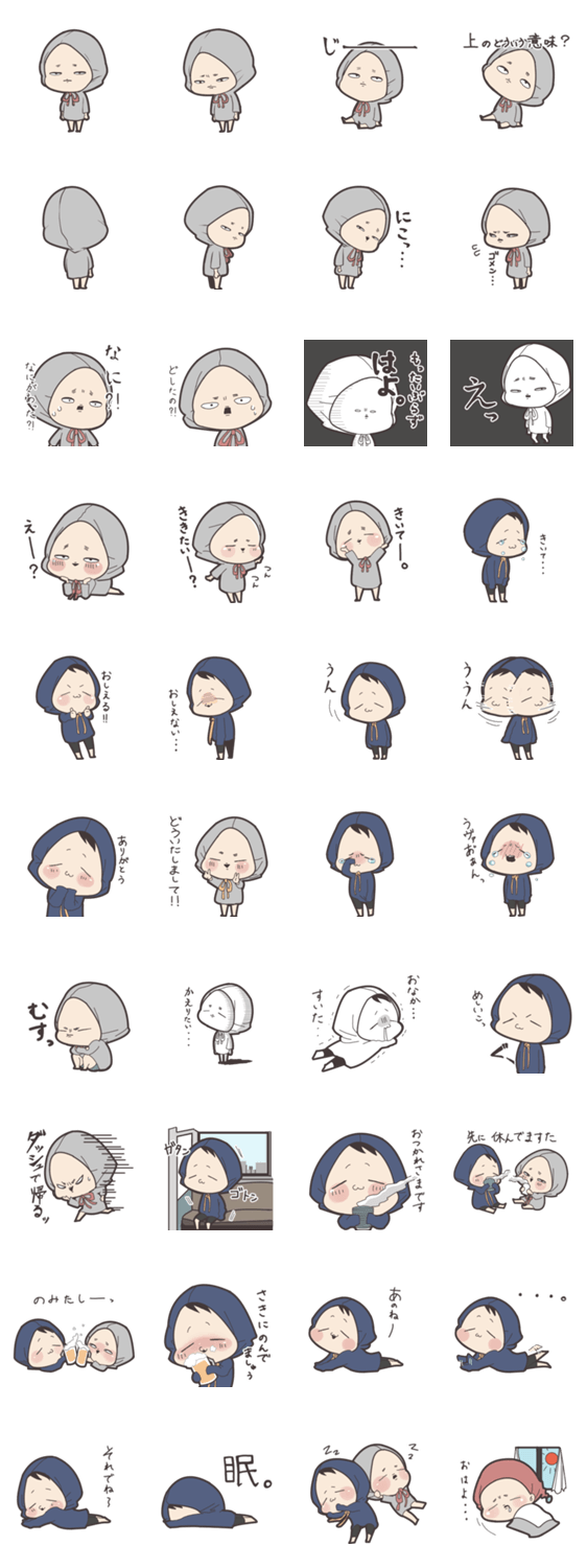 スタンプ説明 むにちゃんとぷにくんはパーカーを着ている。