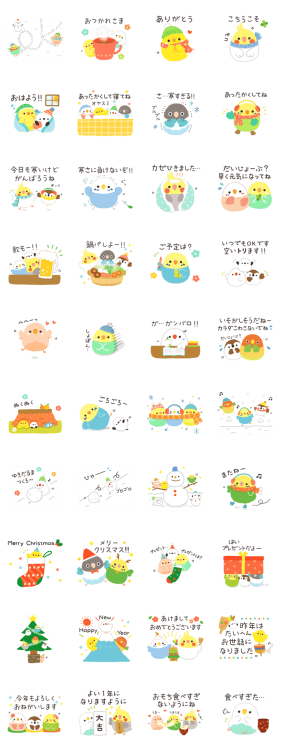 ことりづくしのスタンプ冬バージョンです。さむーい冬に、ことり達もあったか仕様です。クリスマス・お正月にも使えます。2017年のとり年にぜひ♪
