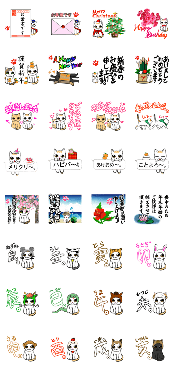 気ままな猫たちの年末年始を中心に様々な挨拶メッセージスタンプ。いつもの仲間に、最近話せていない相手に、紙面の代わりに。こちらはpart.5ということでアレですが旧作も
