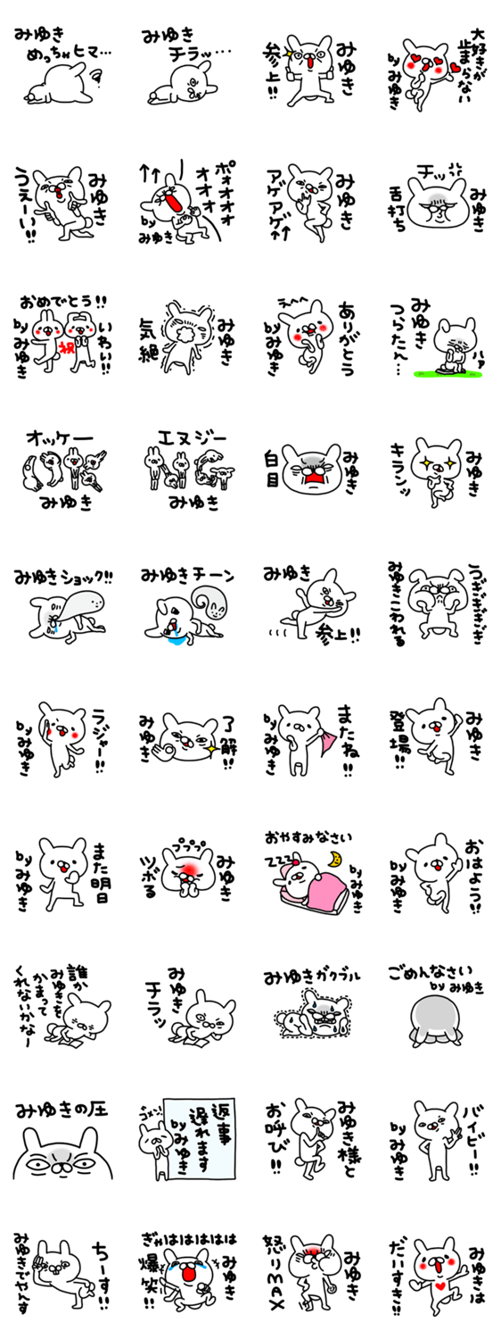 美由紀、美幸、実由希、美由希。全国の「ミユキ」ちゃん専用の名前スタンプです。デカ文字&日常会話の基本セット。(ちょっぴりうざいうさぎ)