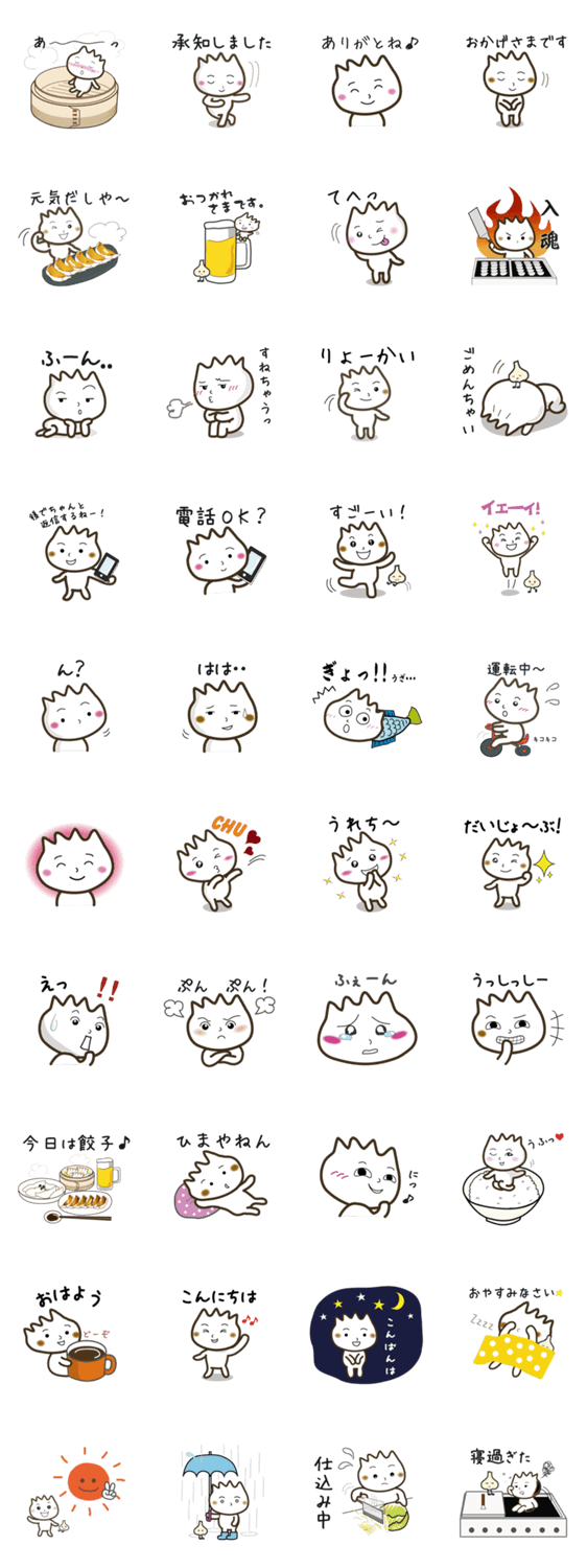 | スタンプ説明 | ぎょーざやさんのぎょーちゃんが、日常会話に使えるスタンプに。どうぞ使ってね~♪ |