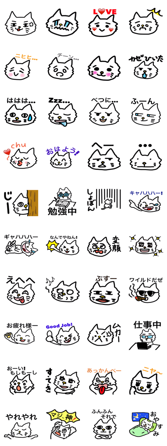 顔芸や多くのリアクションをする猫のスタンプだよ。