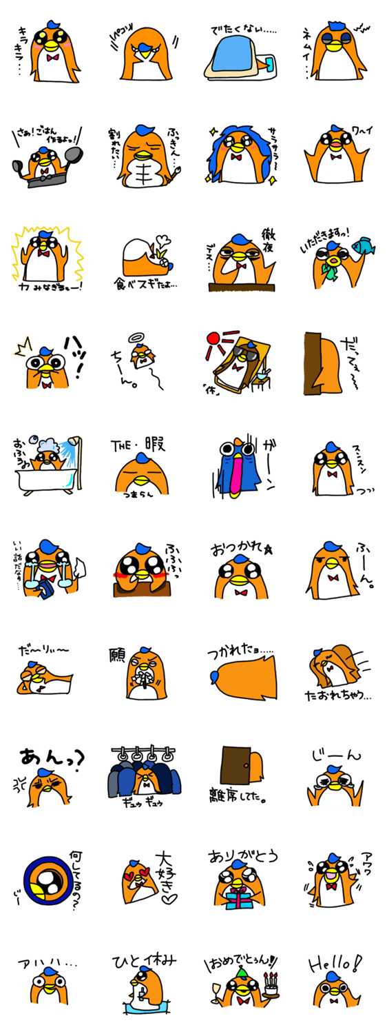 表現がたくさんのおれんじ色ぺんぎんのスタンプです。お友達との会話にお使いください。