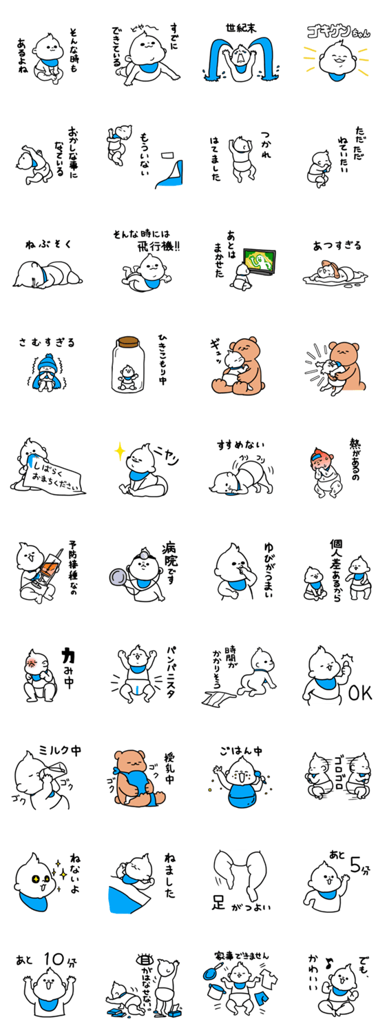 乳児を育てるお母さん/ママのためのスタンプです!ちょっとシュールでかわいい赤ちゃんの真っ白なましろちゃんが気持ちを代弁します。