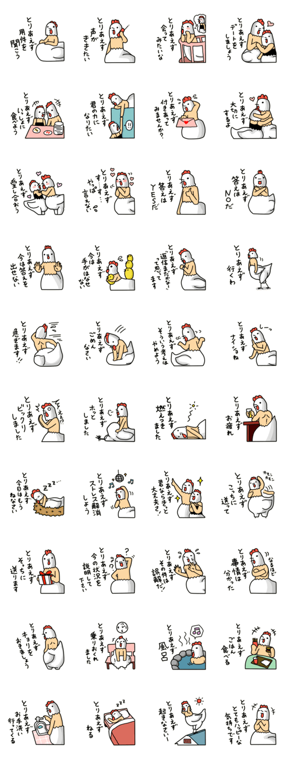 | スタンプ説明 | 「とり」あえずが口癖のにわ「とり」さん 変わった口癖かもしれませんが彼はいい奴なんですよ よろしければ「とり」あえず使ってみてください |