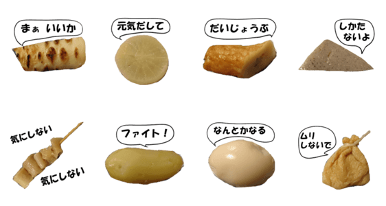 疲れた心におでんたちがそっと励ましてくれるスタンプ修正版です。