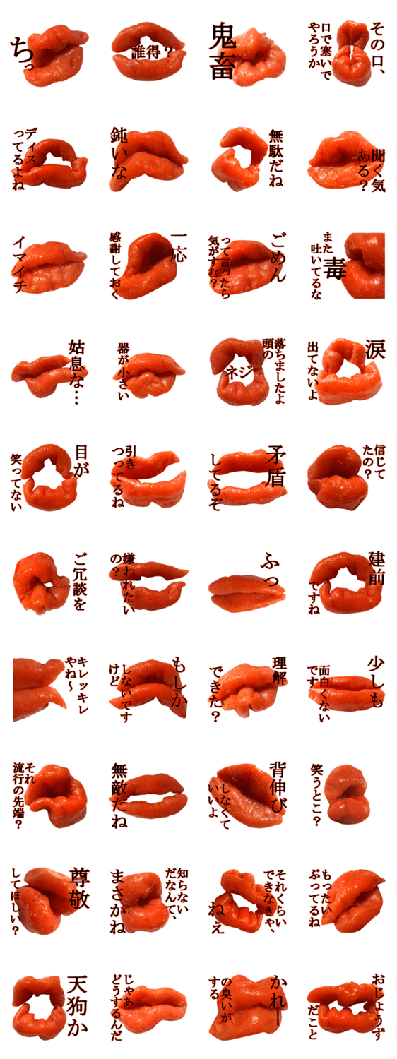 | スタンプ説明 | 「からくちめんたいこくちびる」につづく、さらに辛めの言葉を吐く「中辛たらこくちびる」…つまり明太子。写真をもとに制作した実写版明太子の辛口な言葉たちです。 |