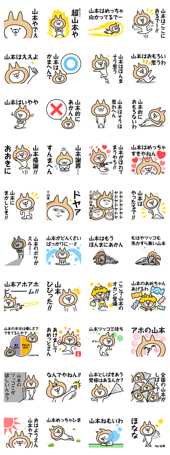 山本さん用の、名前で方言スタンプ。やまもとさんが使える関西弁・大阪弁のねこです。ヤマモトさん専用の正月・お正月のあけおめスタンプ入り。