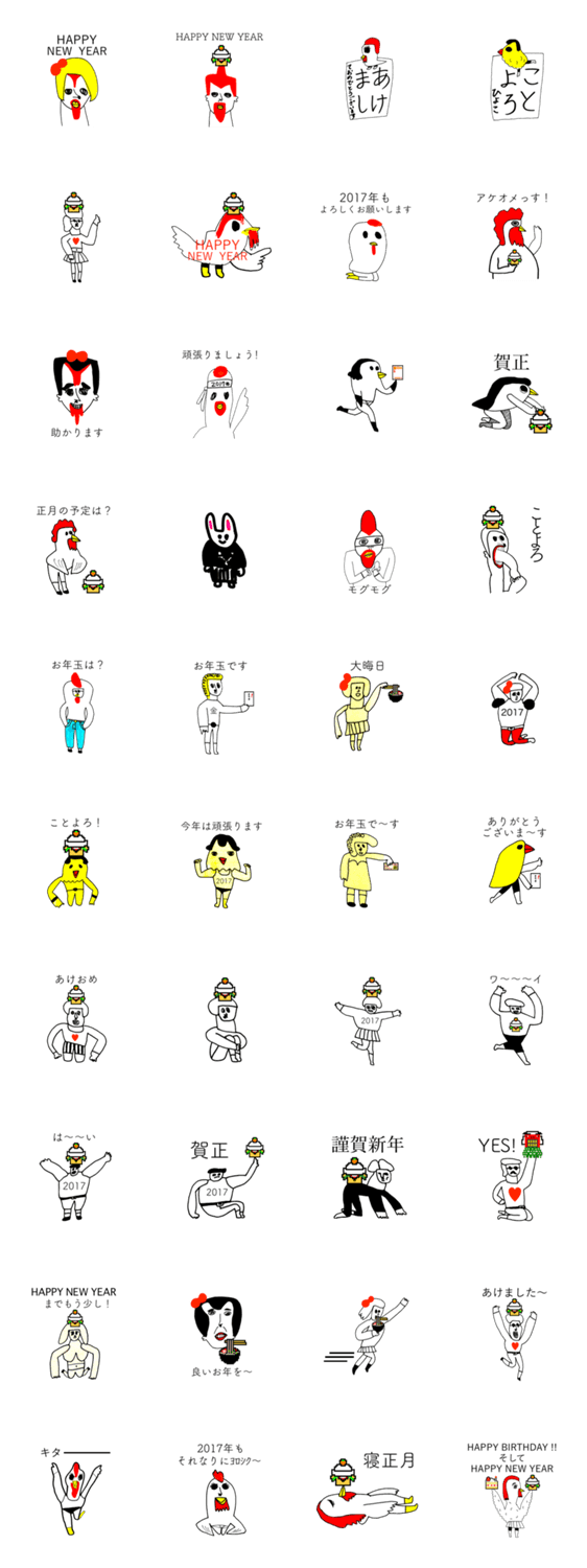 年末年始・2017年のお正月に使えるラクガキスタンプです。酉年なのでニワトリやヒヨコなどのトリさんたちが登場します。