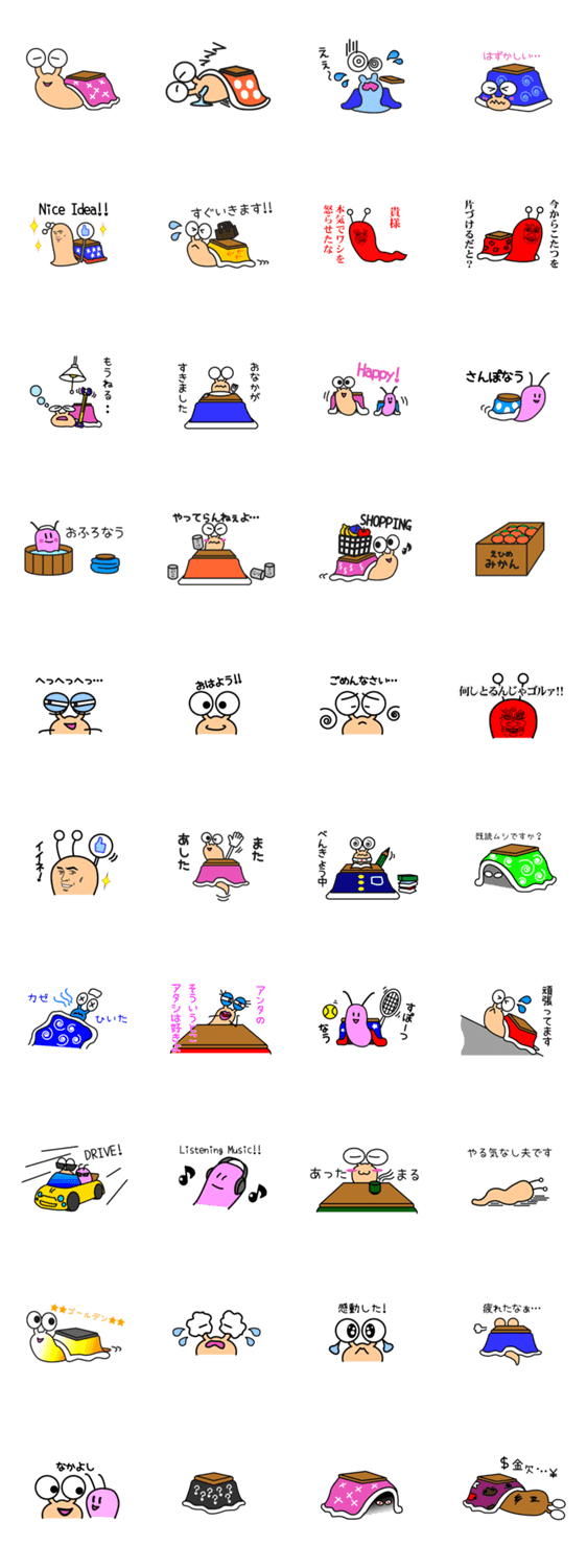 | スタンプ説明 | 冬に日本中で出没する「こたつむり」さんを、かたつむりのままイラスト化してみました。無理やりこたつを片づけようとすると修羅のごとく怒ります(笑)。夏でも使ってね! |