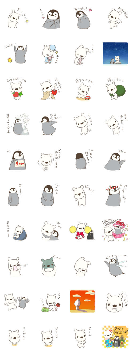 しろくまとペンギンがあなたの気持ちをかわいく、ほんわか伝えます。 使いやすいあいさつや返答を中心に集めました。 「あけましておめでとうございます」あります。