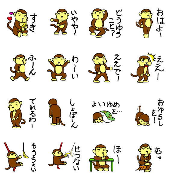 一見、ちょっと内気なふつうのおさる。 でも内面はひねくれ者。冷めた視線で世の中を見ている、実はインテリおさる。関西弁。ええでー てれるわー いややー おはようなど