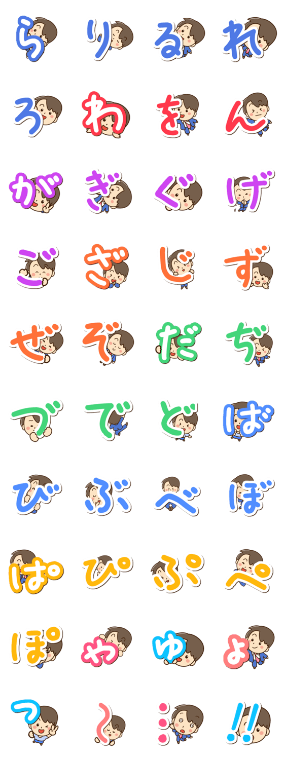 『やさしいパパ』スタンプから『ひらがな編』の登場です。②は『ら』~濁音、半濁音まであります。『あ』~『よ』の①と合わせて、自由に会話を楽しんでください。