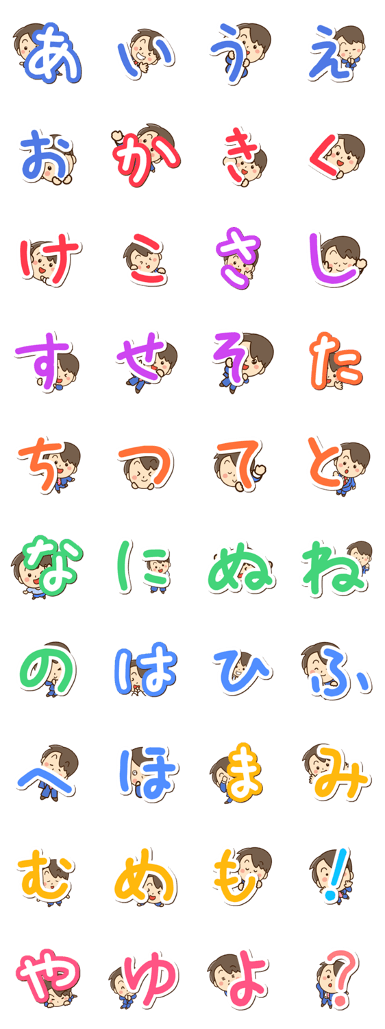 『やさしいパパ』スタンプから『ひらがな編』の登場です。①は『あ』~『よ』まであります。その他の②と合わせて、自由に会話を楽しんでください。【かたこスタンプ】