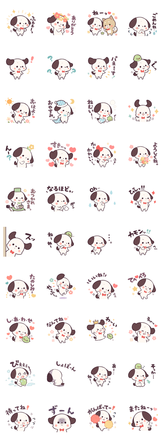 しば犬まろのお友達、ちいさな犬「ころ」のスタンプです。日常で使えるリアクションやつっこみ、挨拶が沢山入っています。