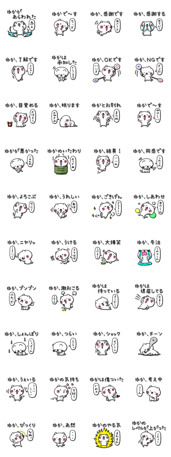 由香、由佳、友香、結花、有香、由夏…、全国の「ユカ」さん専用の名前スタンプです。ちょっぴり飛び出して見える(?)猫キャラ仕様、日常会話の基本セットです。