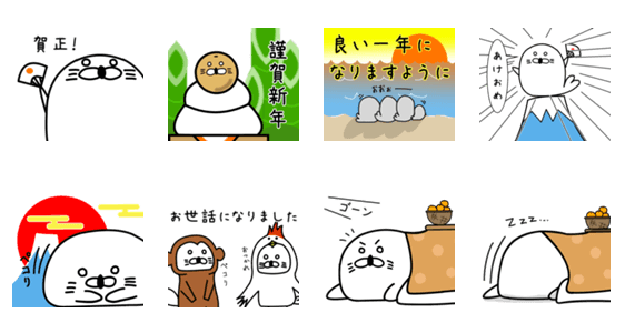 | スタンプ説明 | ちょっぴりシャイな脱力系タテゴト アザラシ「たてまる」のスタンプ正月編です。年末年始のご挨拶や友達、家族との会話に使ってください。 |
