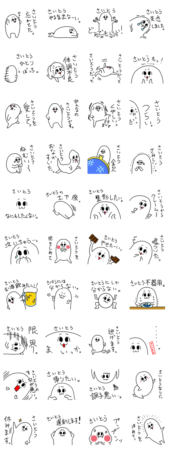 | スタンプ説明 | さいとうの中でもダメな斎藤さん、そんなダメな斉藤さんにぴったりのスタンプ、ダメな齋藤専用、ダメな齊藤さんに送ってもよしダメな〇〇さん(中村、鈴木、佐藤)シリーズ |