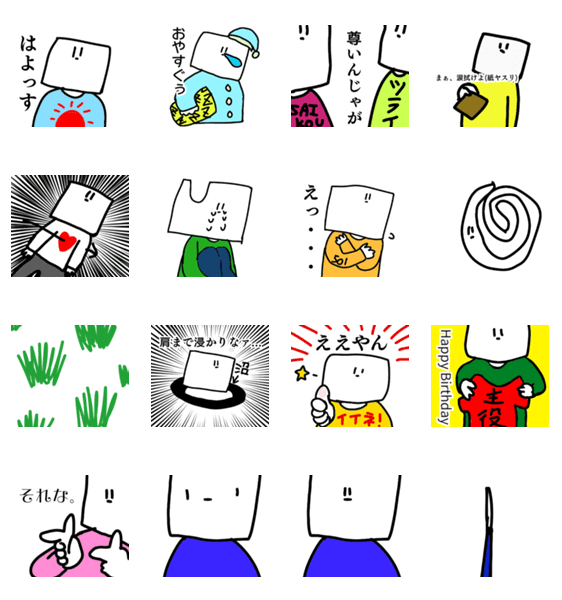 シュールなしかくくんのスタンプ。クスッとくる笑いを貴方に。無表情な姿と表情豊かな背景や言葉が癖になる。