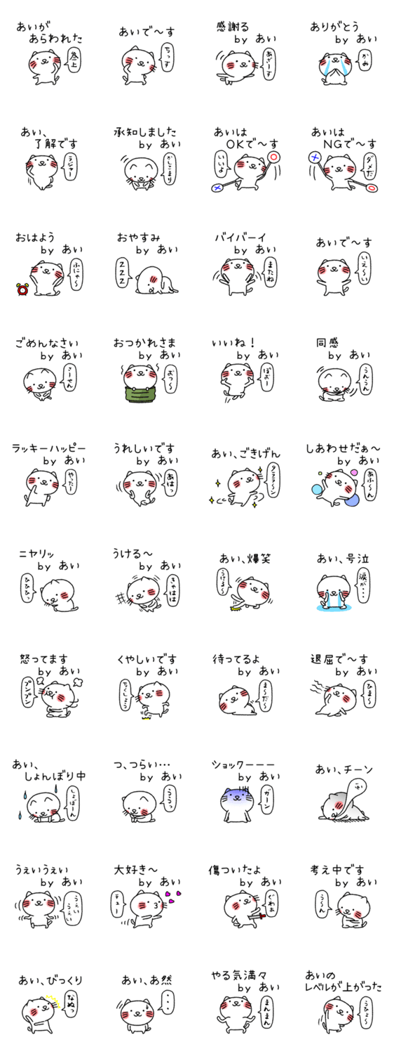 愛、藍、亜依…、全国の「アイ」さん専用の名前スタンプです。猫キャラ仕様、日常会話の基本セットです。