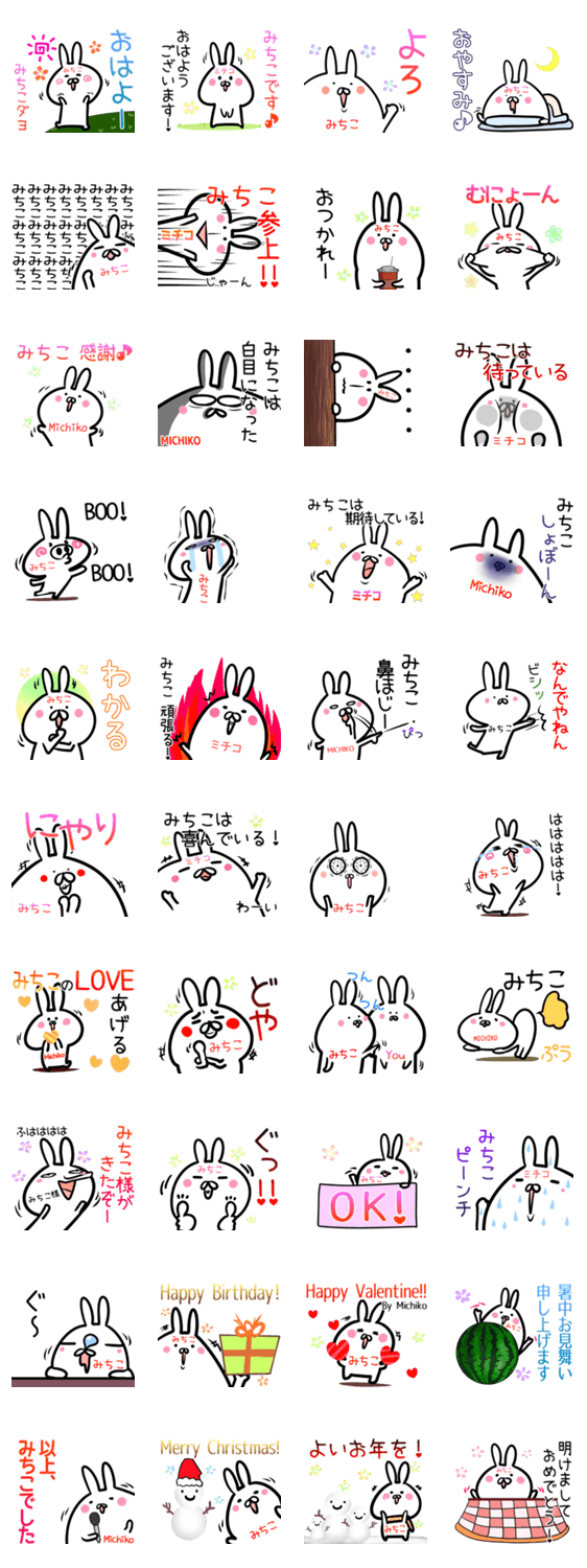 みちこちゃん/ミチコさん用の可愛いウサギのゆるい名前(なまえ)/あだ名スタンプ。美智子/道子/美千子/三智子/通子/みち子等の名前の方専用で送ると面白い♪お正月挨拶入♪