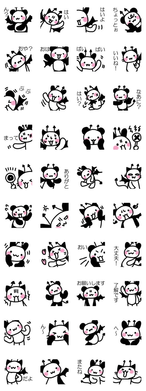 ウサギとパンダとネコのスタンプです。とんがった角と羽と尻尾をもっています。