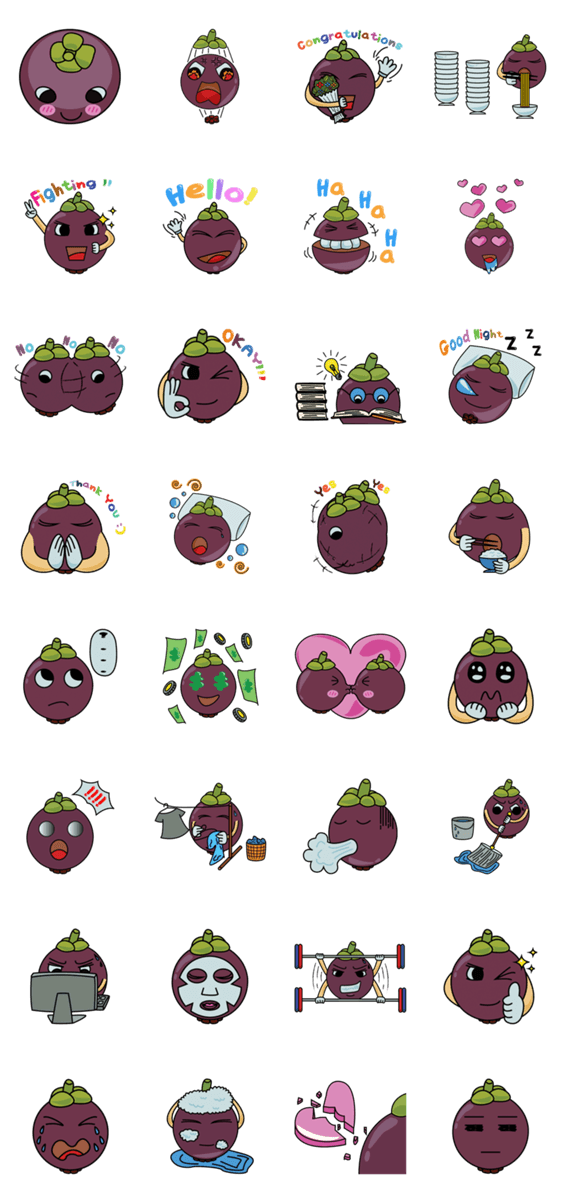 | スタンプ説明 | Hello my name is Purple Mango. I am Mangosteen, fruit can smile and have life. Meet me in chat rooms. |
