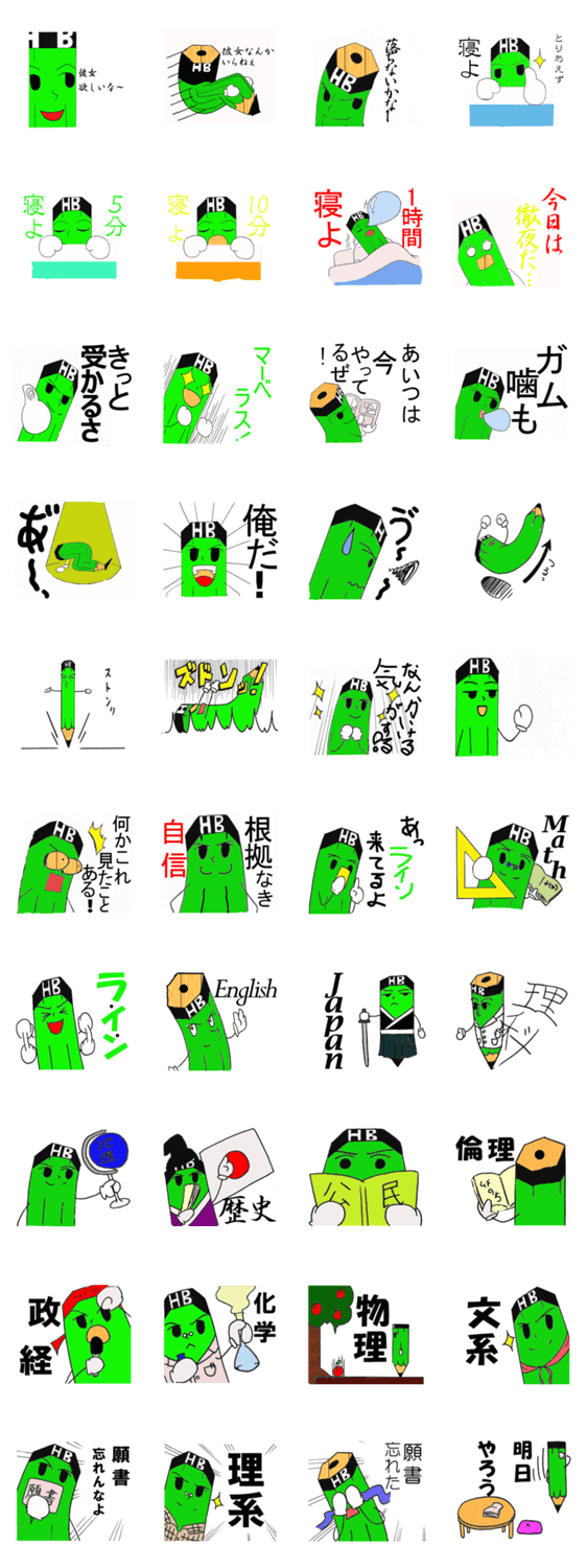 学生が普段使いそうな単語のスタンプです。 かわいい鉛筆がモチーフです。