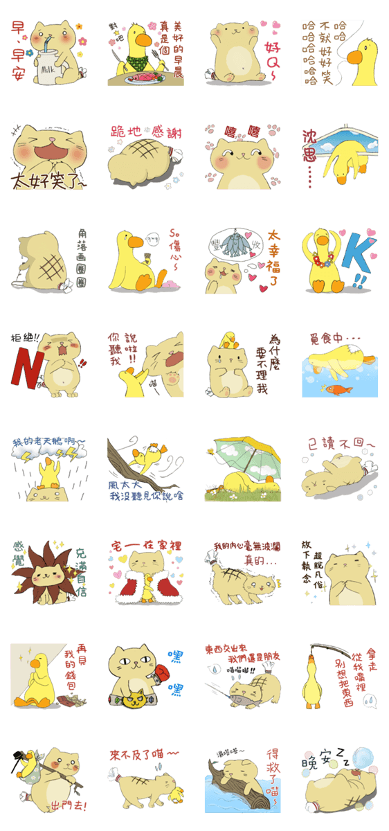 スタンプ説明 かわいいねこと落ち着きすぎるアヒルの雛