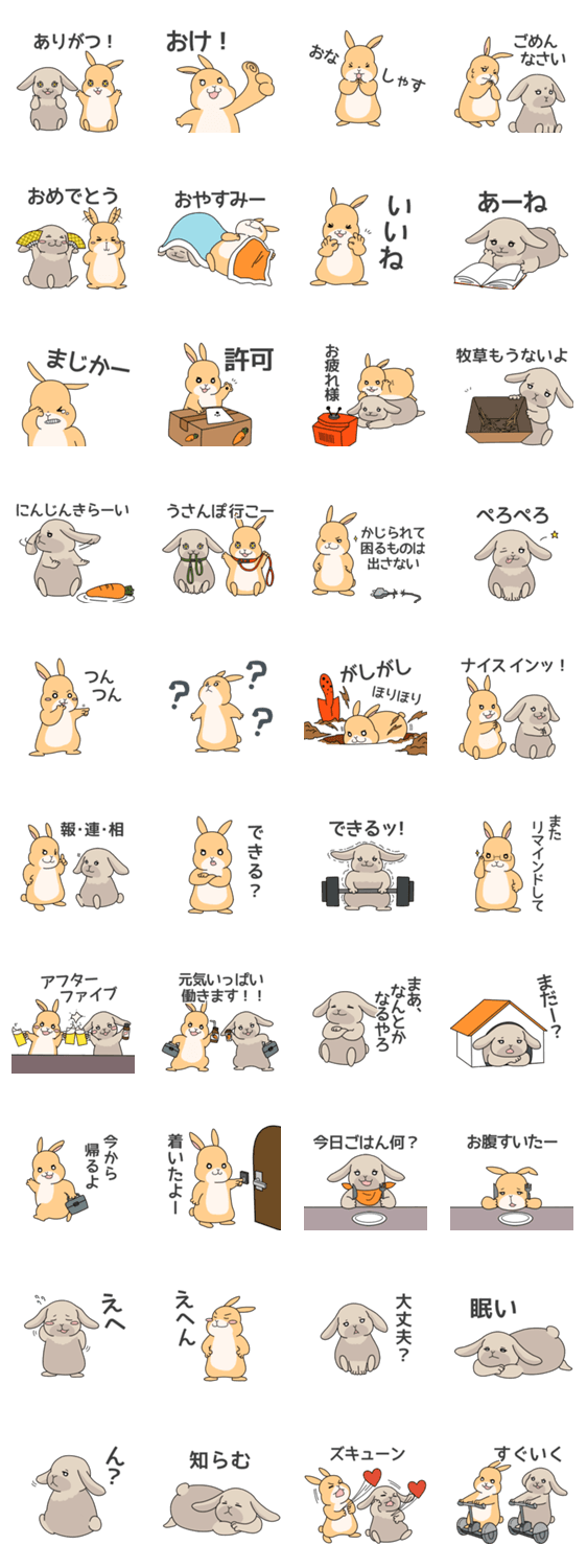 おっとりマイペースな垂れ耳「ふか」と、好奇心旺盛で活発なネザーランドの「くりん」。日常会話やちょっとしたリアクションに役立つ、可愛いうさぎのスタンプです。