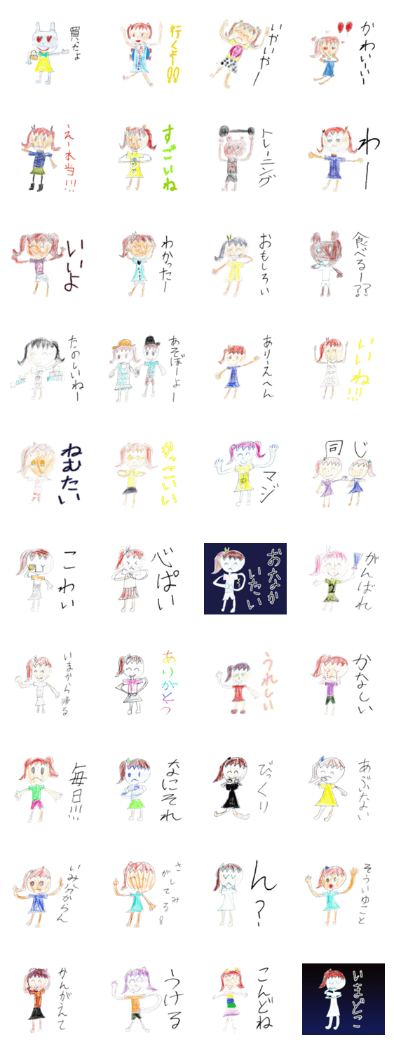 | スタンプ説明 | 小学生が手書きで作ったレインボーちゃんは、日常会話でよく使えるように一生懸命工夫したスタンプです。子供らしいデザインは、老略男女問わずホッコリさせるはずです! |