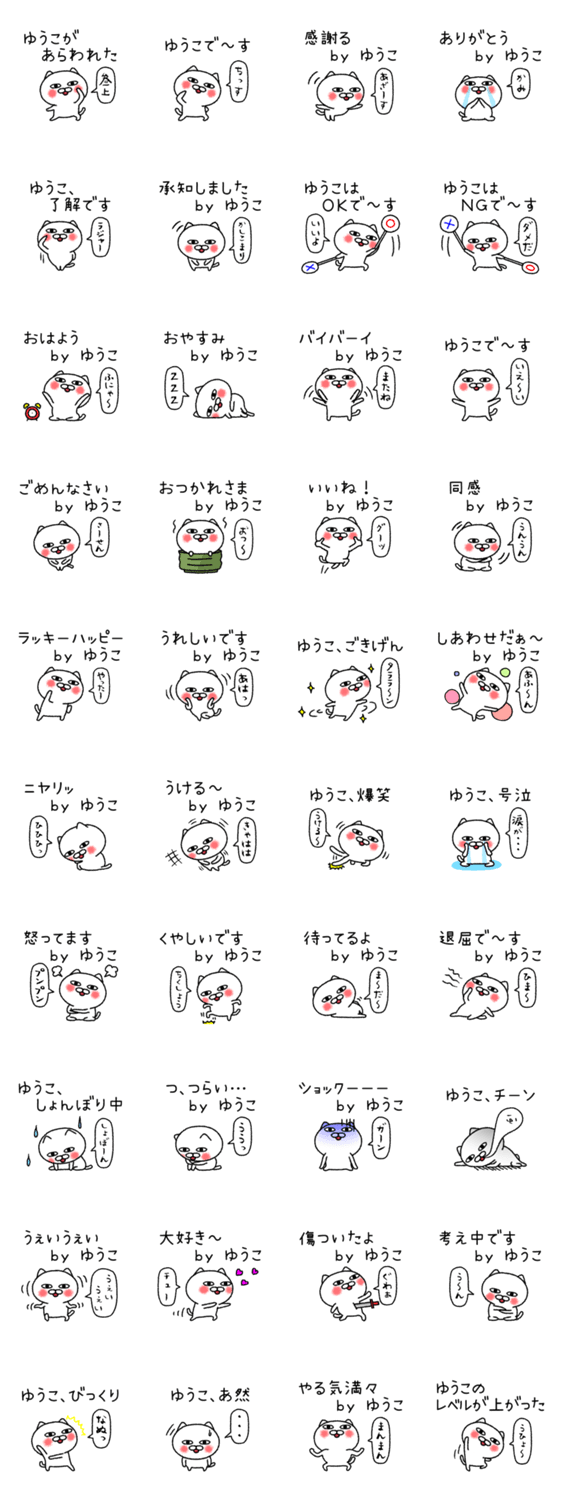 友子、優子、裕子、祐子、佑子、結子…、全国の「ユウコ」さん専用の名前スタンプです。猫キャラ仕様、日常会話の基本セットです。