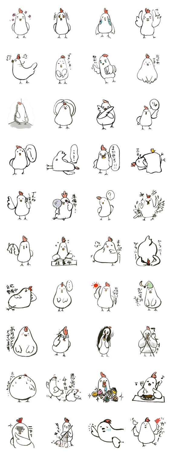 女子系にわとりさんの日常スタンプ。 ちょっぴり毒っ気ゆるめです。 ピーコックの筆書きスタンプ第1弾。