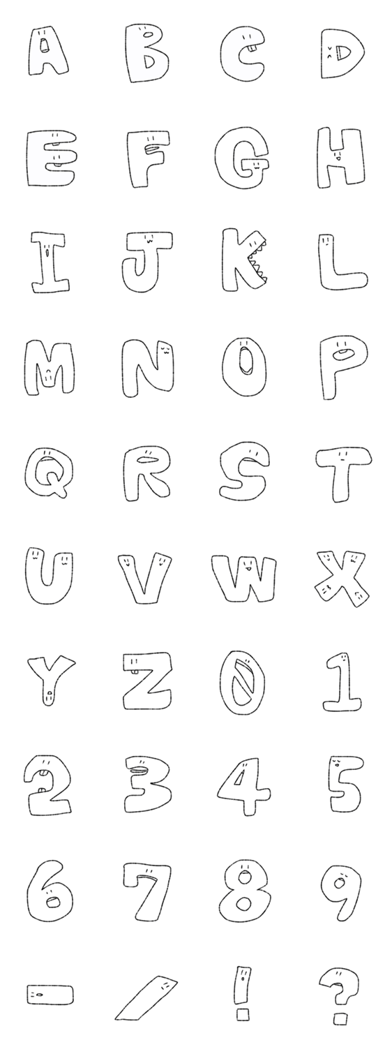 アルファベットと数字と記号の形をしたゆるめスタンプです。