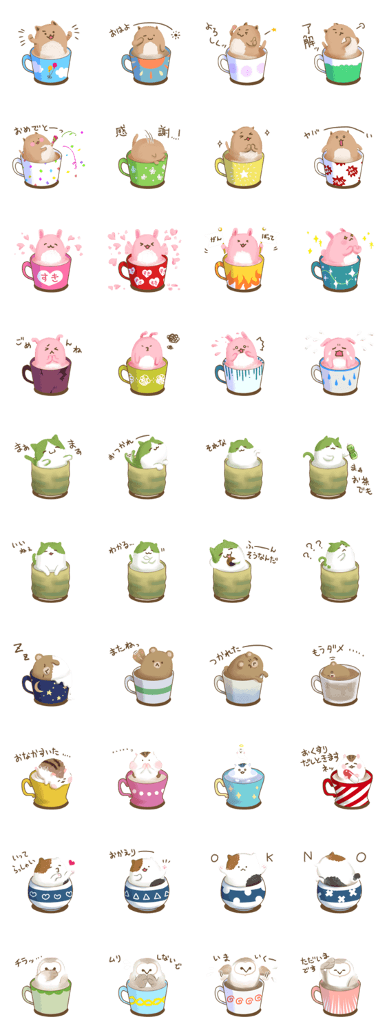 ふんわりとした「ラテっこどうぶつ」たちが、話しかけるスタンプです。