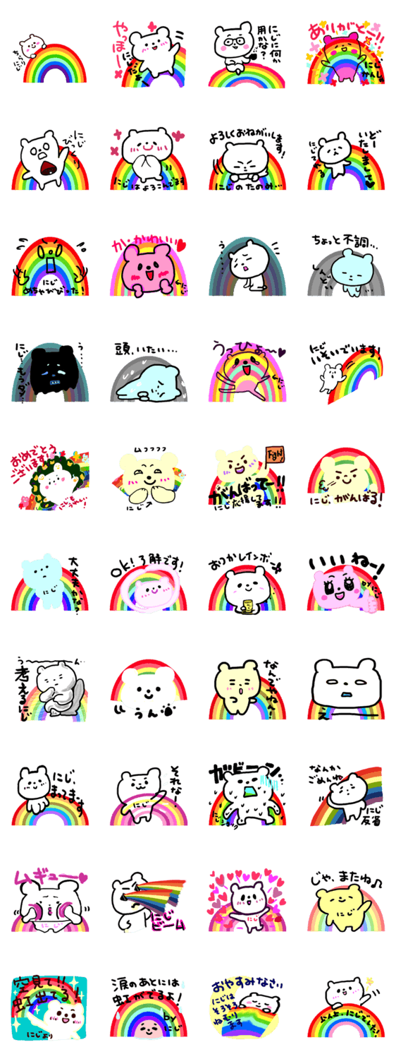 にじちゃんや、にじさん、そのラインつながりの人がつかうスタンプ。くまです。他の名前スタンプよりカラフルでかわいいです。背景の虹がポイント。