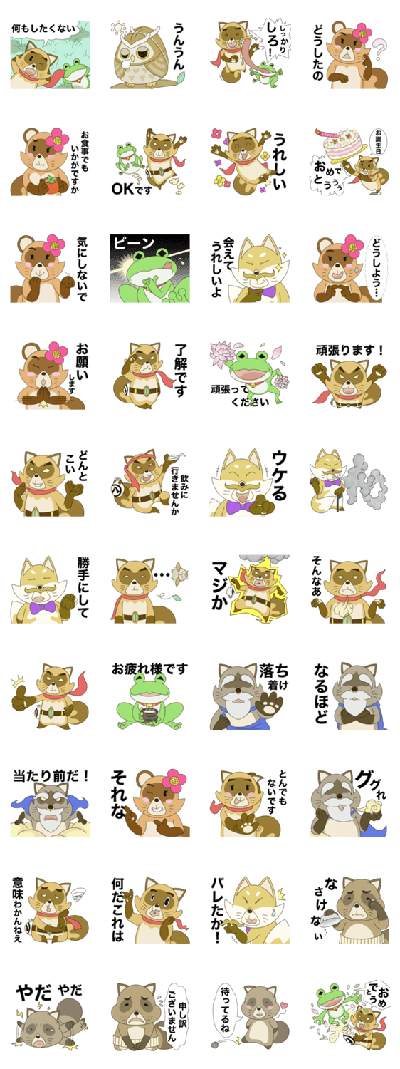 怪盗狸八右衛門シリーズ第二弾。たぬきの八右衛門、カエルのケロ吉、きつねの九雲、金長師匠、花子、太郎親子、共に旅した仲間達の日常系スタンプ!